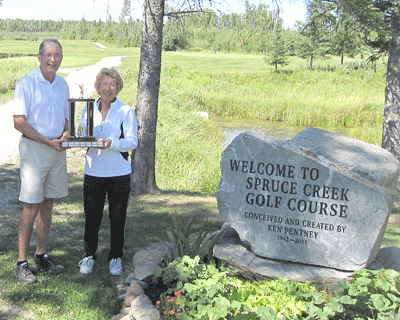 Lorie Kuzyk of Rainy River won the Women's Championship flight at the 44th Rainy River Open this past Sunday. Event organizer Bob McGreevy, left, is seen here presenting Kuzyk with the trophy.