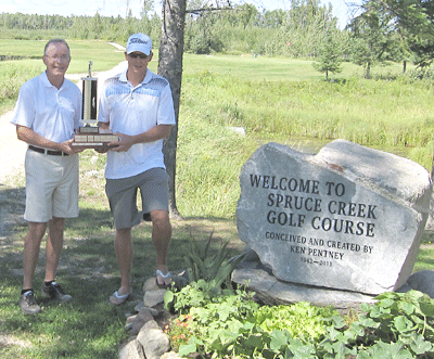 Dewey Beckel of Rainy River won the Men's Championship flight at the 44th Rainy River Open this past Sunday. Event organizer Bob McGreevy, left, is seen here presenting Beckel with the trophy. He shot an 85 on 18 holes to win by one stroke.