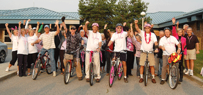 The first team of cyclists left Rainy River Tuesday morning after a pancake breakfast. The crowd present all fist pumped and said "Together we will!" to send, l. to r., Corrie Wiersema, Ron McAlister, Pat Giles, Bob McGreevy, Bill Langner and Wallace Armsrong on their way to Sleeman where another team will take over. The goal of the "Together We Can" fundraising drive is to raise $650,000 to purchase a new digital mammography machine for the three district hospitals.
