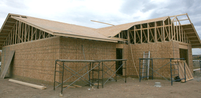 With the beautiful weather of the previous week giving way to clouds, rain, and yes snow, the Sinninghe crew was rushing to get the Rainy River Locum House sheeted in. By the end of Week 5, the roof was on and a stack of shingles was awaiting a break in the weather.