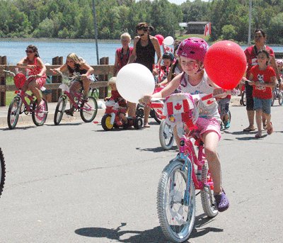 Kennedy Mosher, right, and about 50 other youngsters and a few adults, participated in the annual Canada Day bike parade Monday in Rainy River.