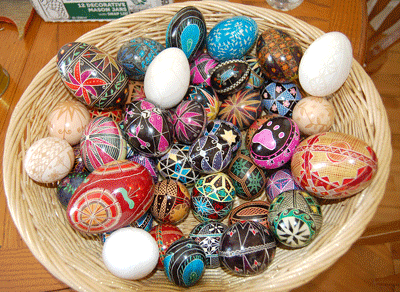 Here is a basketful of beautifully had decorated Pysanka done by Jo-Anne Hagarty of Rainy River.