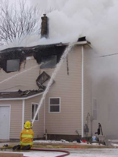 RR volunteer firefighter Ashley Stamler is seen fighting the fire at Don and Monique Gall's RR home Tuesday morning.