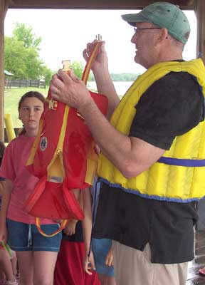 Despite the heavy late afternoon rains Friday about 50 kids showed up for a Kids’ Safety day at Hannam Park in Rainy River. The focus was on water and boat safety. Tom Shumaker is seen here talking the proper way to wear a life jacket.