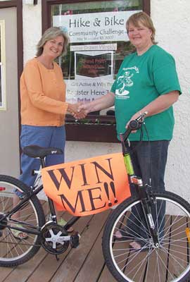 Heidi Ivall, left, of the NWHU, presents Kathy Rose of Rainy River, right, with the grand prize for the Hike and Bike Challenge.
