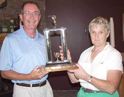 Jean Bernst, right, won the Ladies Flite at the 32nd Annual Rainy River Open. Tourney organizer Bob McGreevy, left presented her with the trophy. Jean Bernst, right, won the Ladies Flite at the 32nd Annual Rainy River Open. Tourney organizer Bob McGreevy, left presented her with the trophy.