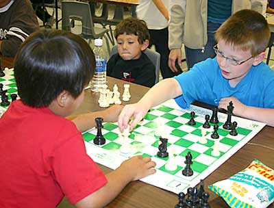 Lemuel Carradice from Riverview School made a move against Gavin Sakchekapo of Crossroads School in the seven and under category of the Rainy River District School Chess Tournament in Devlin on Friday. Carradice is just one of the many students who will move onto represent the district in Thunder Bay next month.