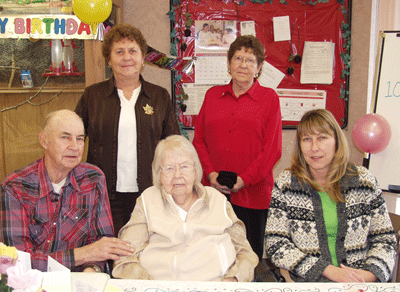 Myrtle Lauzon, front and center, celebrated her 102nd birthday on Friday in Rainy River with friends and family. She is seen here with family members, Jerry Lauzon (her son), Granddaughter Sandra Lauzon, Jean Lauzon and Janet Schaaf.