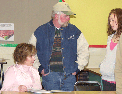 Dorothy, left, and Terry Sharp, center, lookover their daughter, Alexis' portfolio last Monday evening at the annual RRHS Portfolio Night.