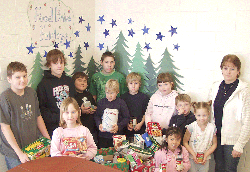 Riverview students voluntarily brought dry food stuffs every Friday for four weeks and last Friday presented it to the Westend Food Bank in Rainy River. They also made crafts and sold them at their recent tea and donated the $162 proceeds to the food bank. Fr. l. to r., Kyle Olson, Spencer Brown, Bethanny Sinninghe, Nicholas Jenson, Damon Short, Aaron Short, Nolan Drennan, Chalina Abraham, Kira Olson, Darrel Jonasson, Lilly Blakeney and Food Bank Treas. Angie Armstrong.