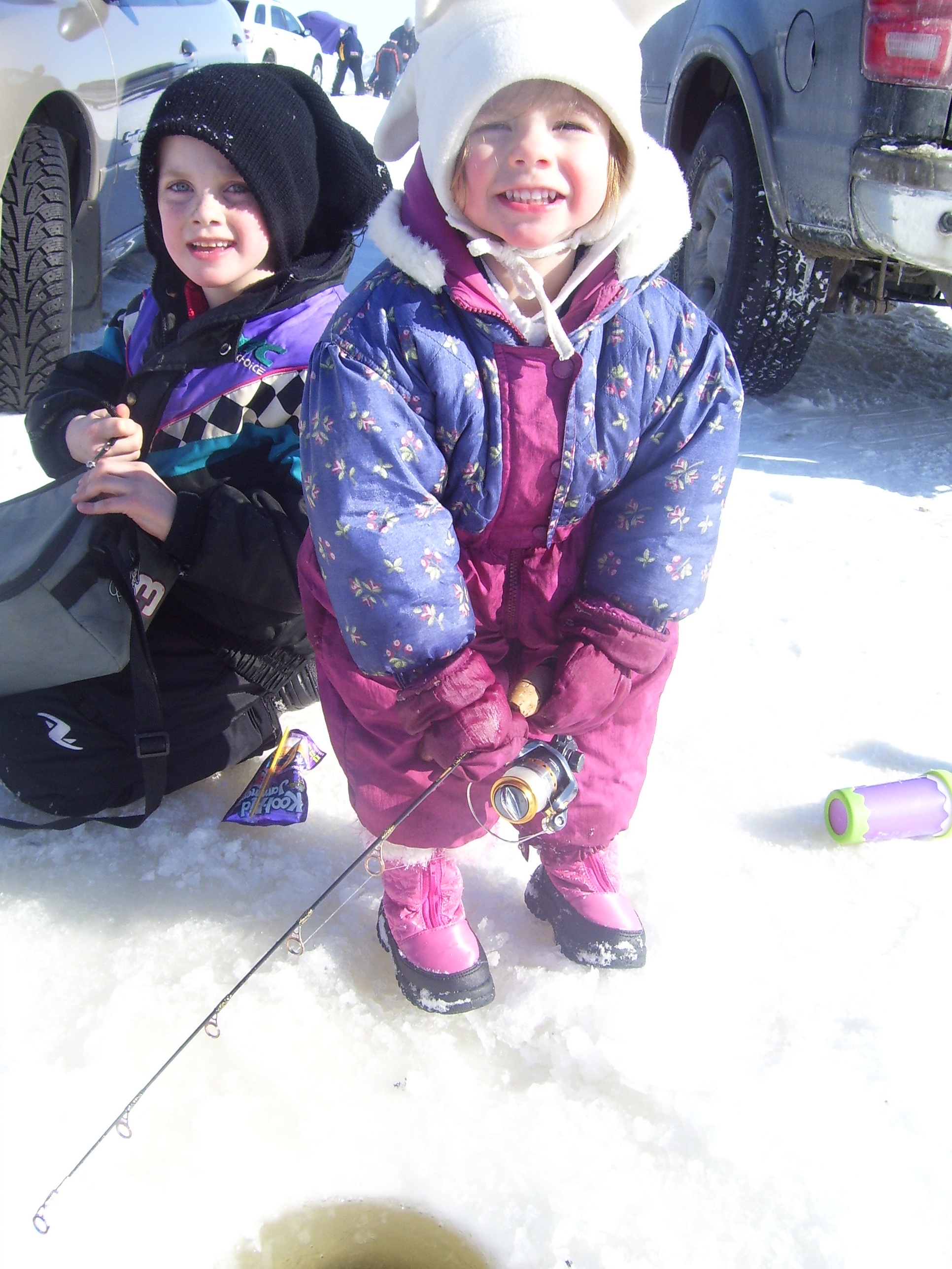 Alexia Gate (2) yelling "Here Fishy, Fishy" and her brother Chandler Pollard (7) at the Morson Fish Derby Saturday. –Submitted photo