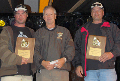 Sean Gaudry, left, and John Blight, right, receive some of the hardware, from RRWT Chair Wes Blight, they earned at the RRWT. They finished third overall and were the Top Princecraft team as well had the biggest basket of fish in the tourney.