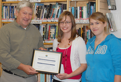 The RRHS Brick by Brick Campaign was recognized by the Rainy River District School Board last week. Every year the board of education meets in Rainy River at least once. Board Chair Dan Belluz presented Brick by Brick committee members Deidre Wilson, center and Teagan Miller with a certificate. The group raised more than $13,000 to build a school in Siere Leone.