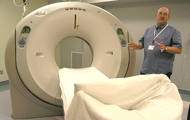 X-ray technologist Mark Addison showed those taking the tour Thursday how the 64-slice Toshiba Aquilion CT scanner at La Verendrye Hospital works.