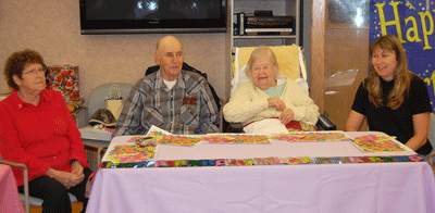 Myrtle Lauzon, second from the right, was all smiles Monday as family and friends gathered in the commons room at the Rainy River Long Term Care Facility to celebrate her 103rd birthday. From the left, her daughter-in-law Jean Lauzon, her son Jerry Lauzon, Myrtle and her granddaughter Sandy Lauzon. They had live entertainment and cake for all! Myrtle is one of two Centenarians living at the Rainy River LTC.
