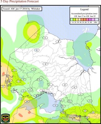 A low pressure system has been active in the northwest Ontario since Wednesday June 11 and has brought with it rainfall in the amounts ranging from 10 mm – 170 + mm throughout the Rainy River / Fort Frances / Atikokan areas. Minimal rainfall amounts are expected for the next few days; however further rainfall amounts of 20 - 50 mm (cumulative) are expected later in the week.