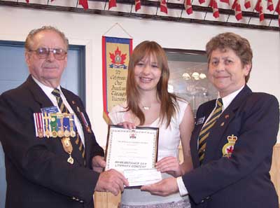 RRHS grade nine student Deidre Wilson, center, received a certificate and $25 for her prize winning Remembrance Day Poem from Legion President Gerry Marchuk, left, and Legion Poppy Chairperson Janet Schaaf, right. See story and poem in Local News on this site.