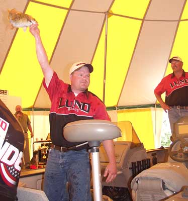 Doug Vandersteen, right, watches as his teammate Mark Pentney, hoists one of the five fish on day 2 that helped them win the Morson Bass International for the first time.